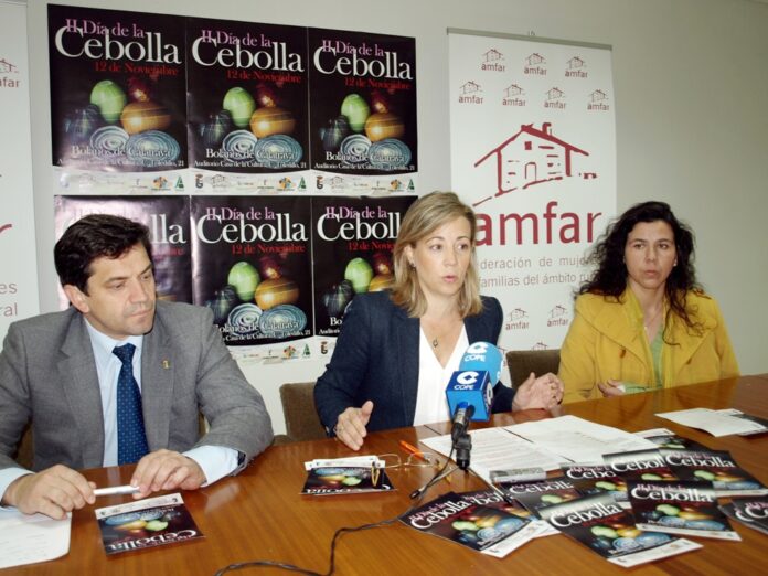 La presidenta de la Federación de Mujeres y Familias del Ámbito Rural (AMFAR), Lola Merino; la presidenta de AMFAR Bolaños de Calatrava, Isabel López, y el alcalde de la localidad, Miguel Ángel Valverde han presentado hoy en rueda de prensa el II Día de la Cebolla, que se celebrará este miércoles, 12 de noviembre, en el Auditorio Casa de la Cultura de Bolaños de Calatrava (Ciudad Real) a partir de las seis de la tarde.