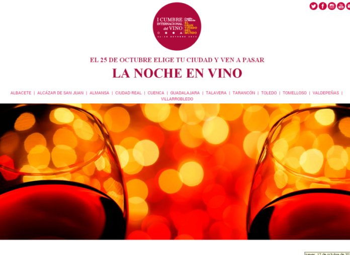 Uno de los pilares de la I Cumbre Internacional del Vino será La Noche en Vino, una actividad que se llevará a cabo el viernes 25 de octubre en doce ciudades de Castilla-La Mancha y que pretende poner en valor el maridaje de la Cultura y la Sociedad en apoyo del vino castellano-manchego.