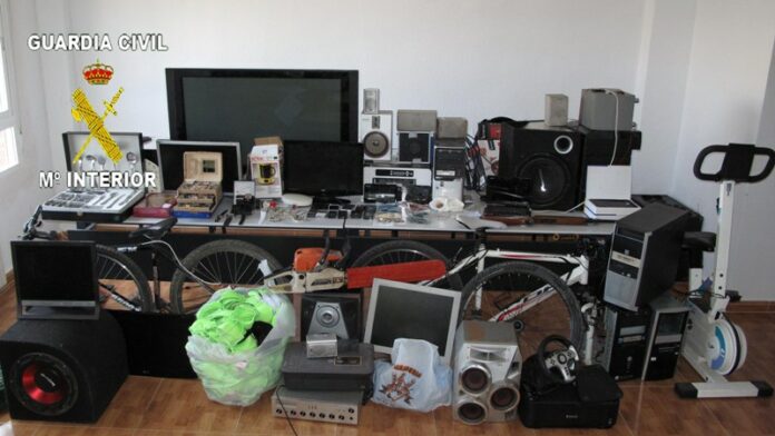En este registro también fueron intervenidos objetos procedentes de varios robos, tales como una carabina de aire comprimido, una motosierra, tres impresoras, cuatro monitores de ordenador, un ordenador portátil, cuatro CPU de ordenador, dos tabletas, un ecualizador, un equipo de sonido, dos bafles, una cafetera, un microondas, ciento doce sujetadores, dos televisores, once móviles, nueve relojes de pulsera y dos bicicletas.