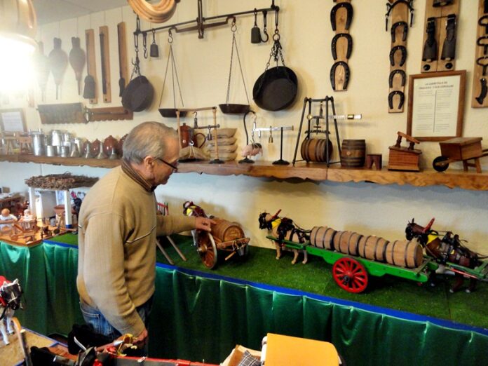 Nos va mostrando uno a uno todos los objetos que ha construido, el pasado laborioso de nuestra ciudad en una habitación. Arados de madera, podones, el carro de los collereros, el del unto, la bicicleta del segador, la era, el carro que le traía el carbón a Jonás, el de la arena. Memoria viva de un tiempo, tal vez demasiado reciente, de penares y faenas hercúleas.