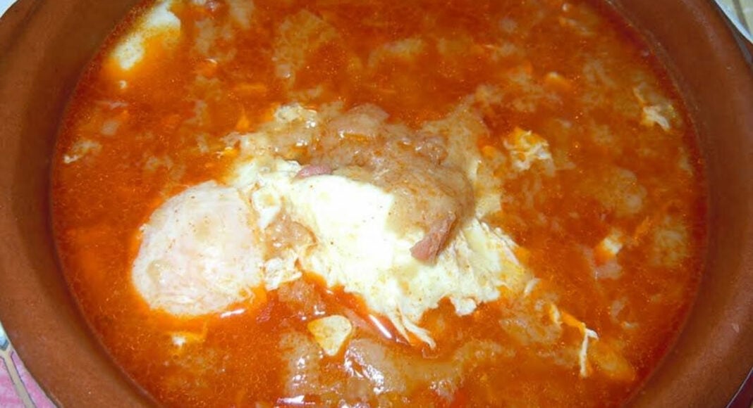 En una olla se pone el aceite a calentar, y se fríen los ajos troceados. Cuando se han dorado se apartan y se sofríen las almejas hasta que se abran, se apartan y se fríen las rebanadas de pan que también se apartan. A continuación se añade el pimentón al aceite y se sofríe durante 4 ó 5 segundos, se añaden los ajos, el tomate, y el fumé, cuando rompa a hervir se echan las rebanadas de pan, se deja cocer todo junto durante 4 ó 5 minutos, y se añaden las almejas abiertas y las gambas peladas, se deja un minuto, se aparta, y se sirve sobre las cazuelas de barro calientes con el huevo dentro.