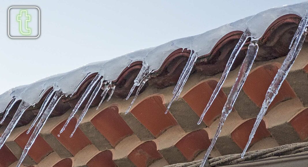 Aquí en la imagen, una fila de afilados carámbanos, sobre el tejado de una casa, unos hielos puntiagudos de unos 40 centímetros aproximadamente. Estos fueron fotografiados a las 15:00 horas, con una temperatura de un grado positivo, y dándoles el sol, así que unas horas antes, en la madrugada, tuvieron que alcanzar un tamaño mucho mayor.