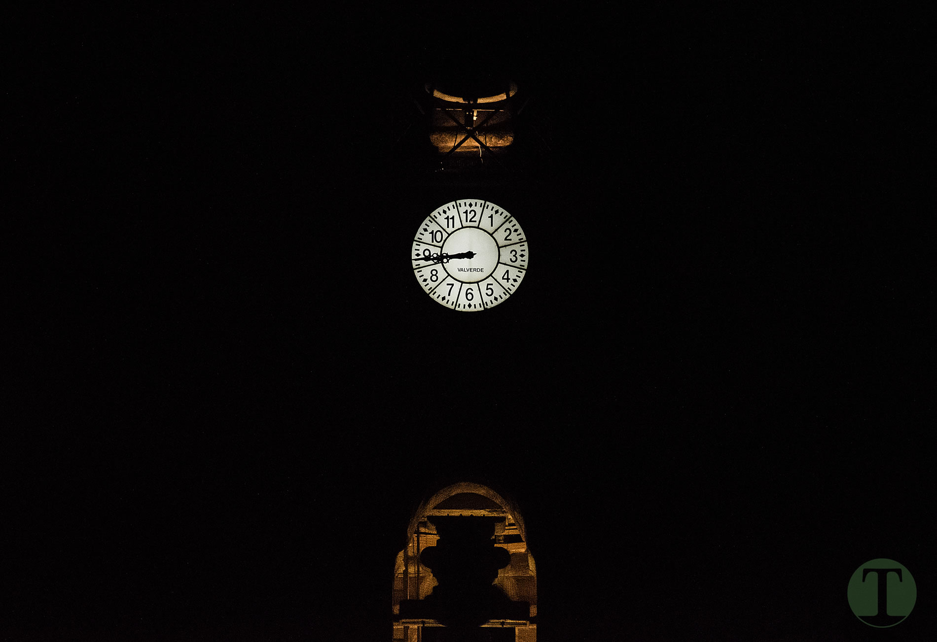 Y, como decía al principio, solo en algunas zonas se pudo disfrutar de ella. Aquí, en Tomelloso, los nubarrones y la lluvia que nos acompañaron prácticamente todo el día la hicieron poco visible, salvo en contados momentos. Así que, haciendo tiempo por si asomaba la superluna, pude hacer algunas fotos en el entorno de nuestra plaza, como esta, que muestra un detalle de la torre de la Iglesia de Nuestra Señora de la Asunción, con su campanario y su reloj marcando las 20:44 horas del 5 de noviembre de 2025.