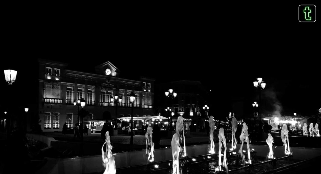 Destaca, en la noche, la iluminación blanca de nuestra casa consistorial y los chorros de las nuevas fuentes, haciendo que sea apetecible fotografiar, aún dejándote las manos heladas.