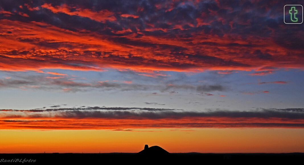 Esta captura fue tomada justo en el amanecer del martes 25 de febrero, el sol aparecía por el horizonte dejando un cielo de color anaranjado en su parte baja y tiñendo las nubes de rojo, dejando en total contraluz todo el horizonte, y el perfil de un bombo.