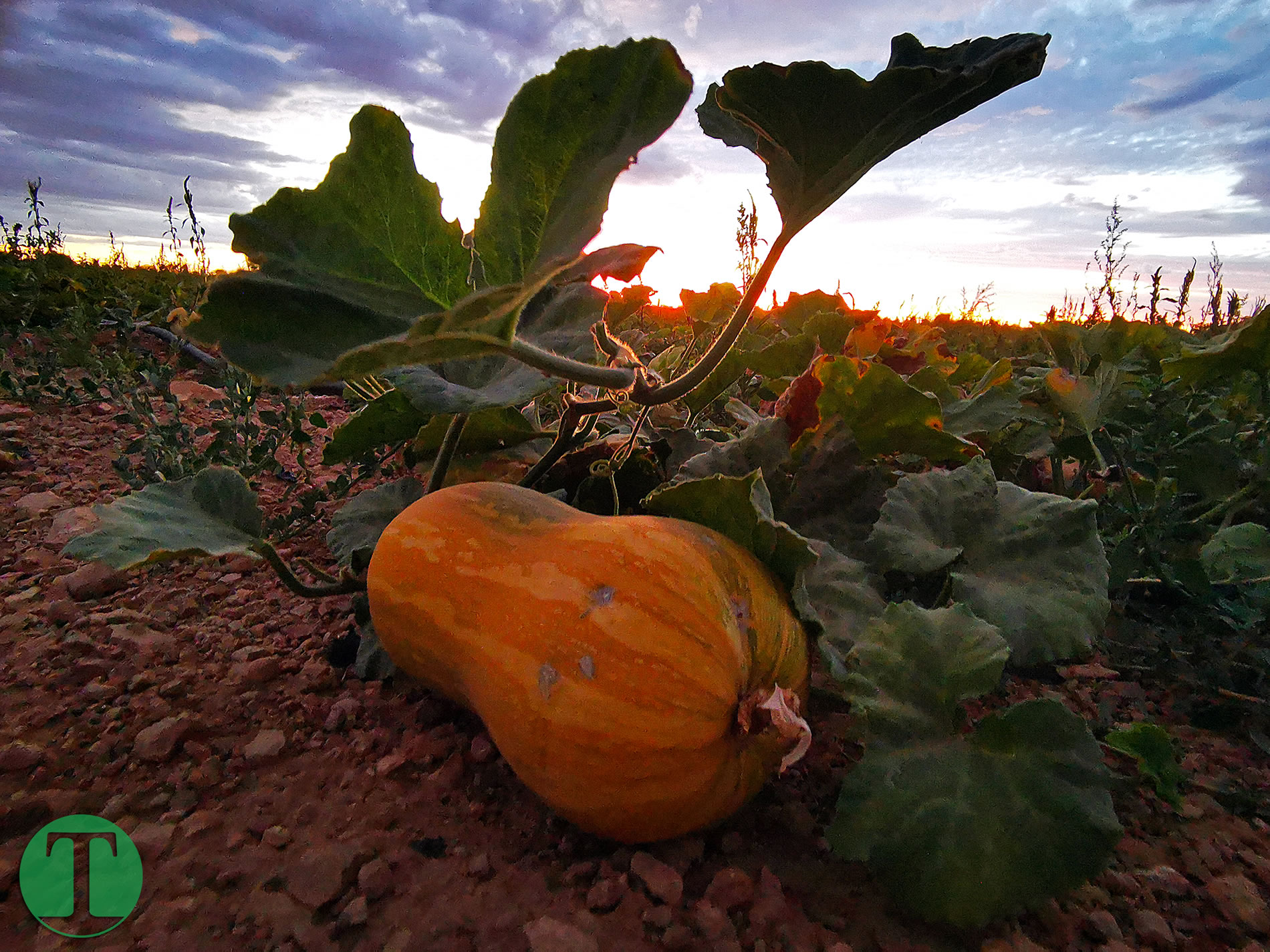 Además de las vides y los melonares, también hay plantaciones que están en plena campaña —como las cebollas y los pimientos— y algo menos común, pero que lo hay, como se demuestra en la foto: un sembrado de calabazas en todo su esplendor, a días, u horas, de que se recoja esta hortaliza tan ligada al Halloween aunque, por aquí, seguro que gusta más en potaje.