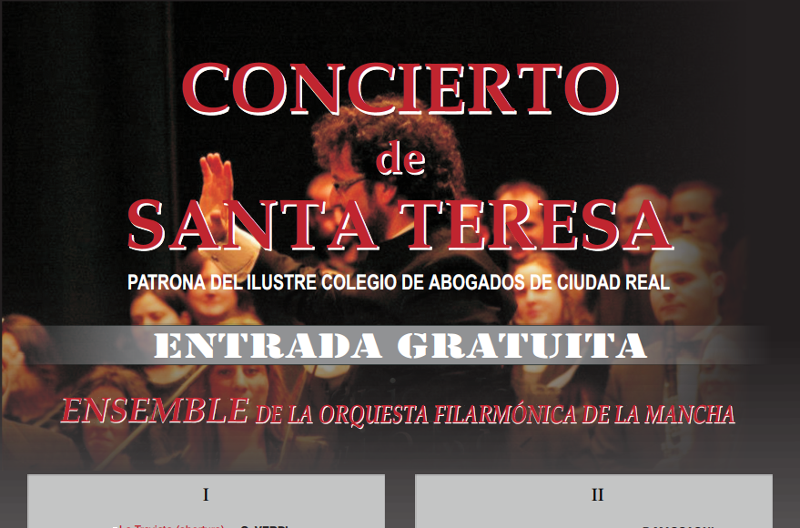El Colegio de Abogados ha organizado para el miércoles 9 de octubre el ya habitual Concierto de Santa Teresa, Patrona del mismo, con motivo de su festividad. Este año estará a cargo del ENSEMBLE DE LA ORQUESTA FILARMÓNICA DE LA MANCHA que interpretará temas de VERDI, BARTOK, MOZART, GRIEG, BRAHMS, FALLA, STRAUSS, MASCAGNI Y PIAZOLLA