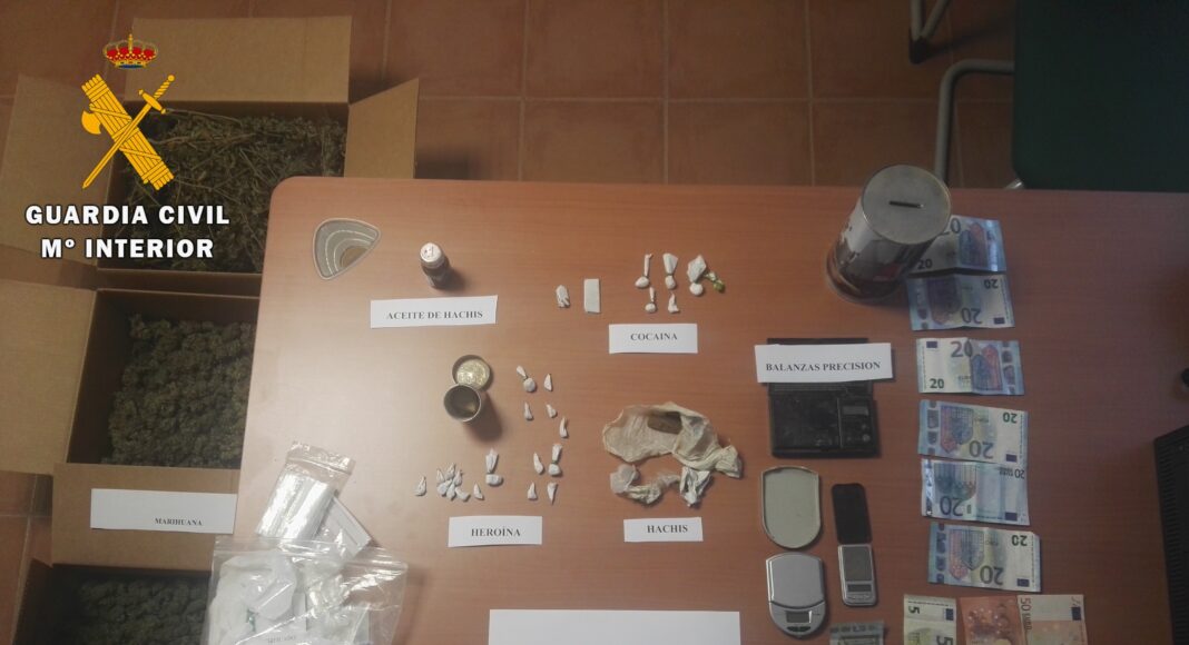 La Guardia Civil solicitó a la Autoridad Judicial correspondiente una autorización de entrada y registro para el domicilio del detenido, donde se hallaron, en distintas estancias de vivienda, cantidades de cocaína, heroína, marihuana y hachís, dosificadas y preparadas para su venta, sustancias de corte y básculas de precisión.