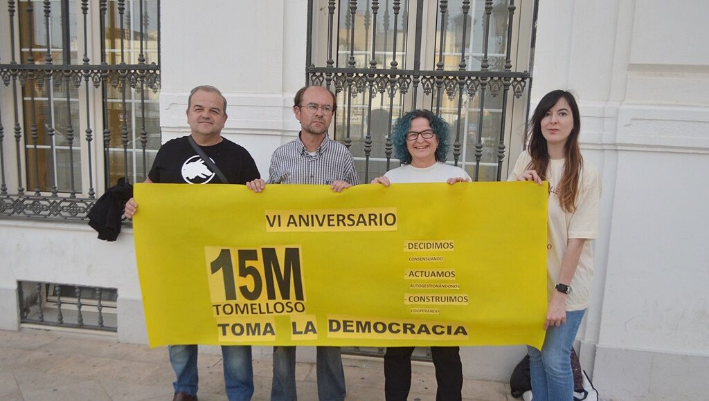 El 15M celebró este lunes en Tomelloso el sexto aniversario del movimiento con una concentración en la plaza de España, en la fachada principal del ayuntamiento. También se anunció la presentación en el Registro del Ayuntamiento de un Reglamento de Participación Ciudadana, elaborada por el movimiento.