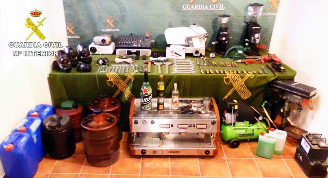 Realizándose un registro de la misma se incautaron 300 litros de gasóleo, 2 baterías, 10 litros de anticongelante, gran cantidad de herramientas de mano, un compresor, una taladradora industrial de columna, un cortasetos, dos proyectores, tres flashes de discoteca, una mesa de mezclas, un amplificador, un micrófono, dos auriculares, una linterna, una cafetera industrial, dos molinos de café industriales, dos taladros percutores, varias botellas de bebidas alcohólicas, procedentes de varios robos y reconocidos posteriormente por sus legítimos propietarios, valorado todo ello en 15.500 euros.