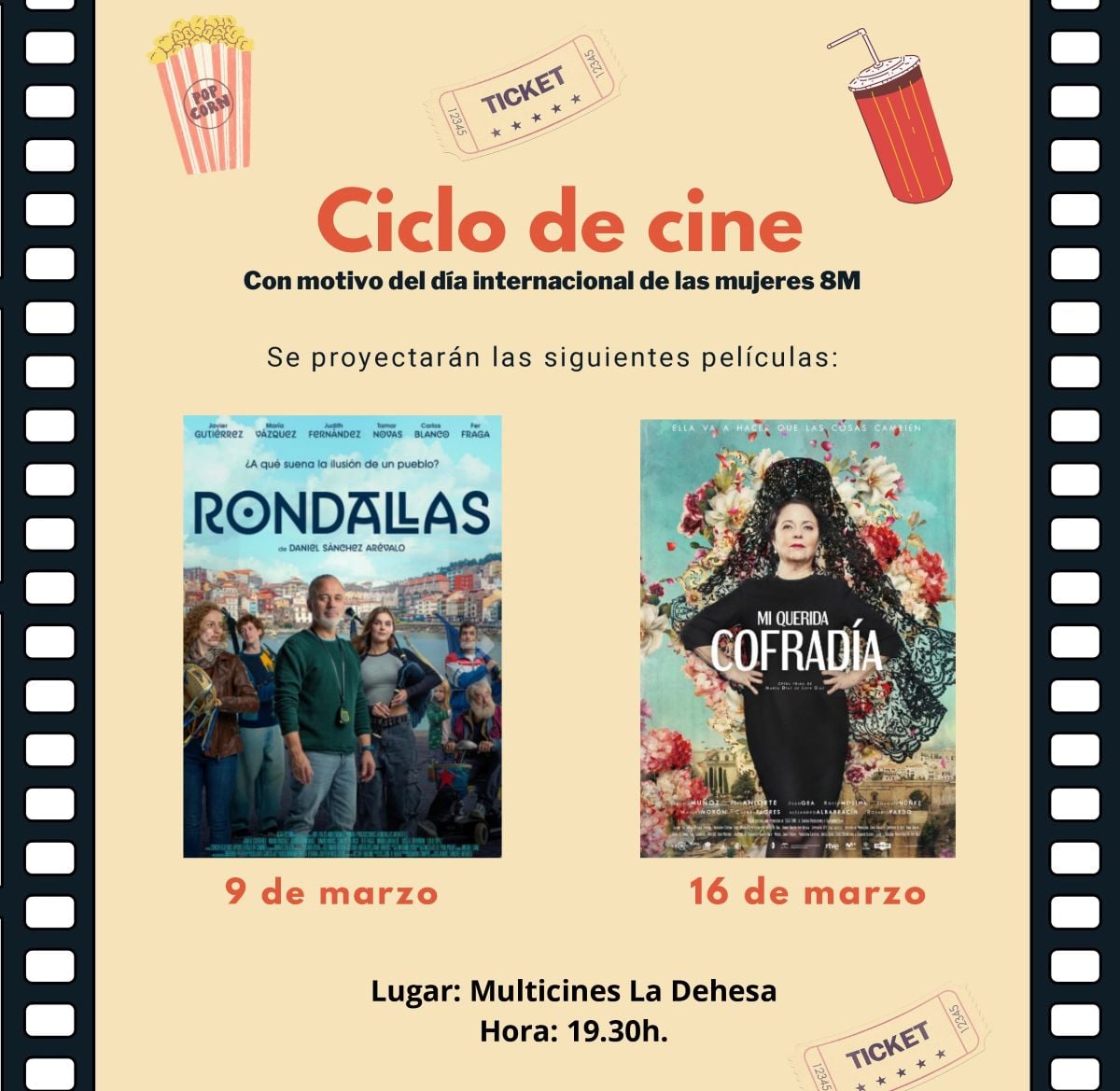 Dentro de este ciclo, el lunes 16 de marzo a las 19:30 horas se proyectará la película “Mi querida cofradía”, una comedia española que aborda temas relacionados con el papel de la mujer en entornos tradicionalmente masculinos.