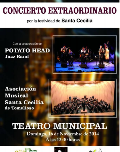 Este domingo 16 de Noviembre, a las 12:30h tendrá lugar en el Teatro Municipal de Tomelloso el concierto en honor de Santa Cecilia. Como artistas invitados contarán con The Potato Head Jazz Band. La entrada es gratuita hasta completar el aforo.