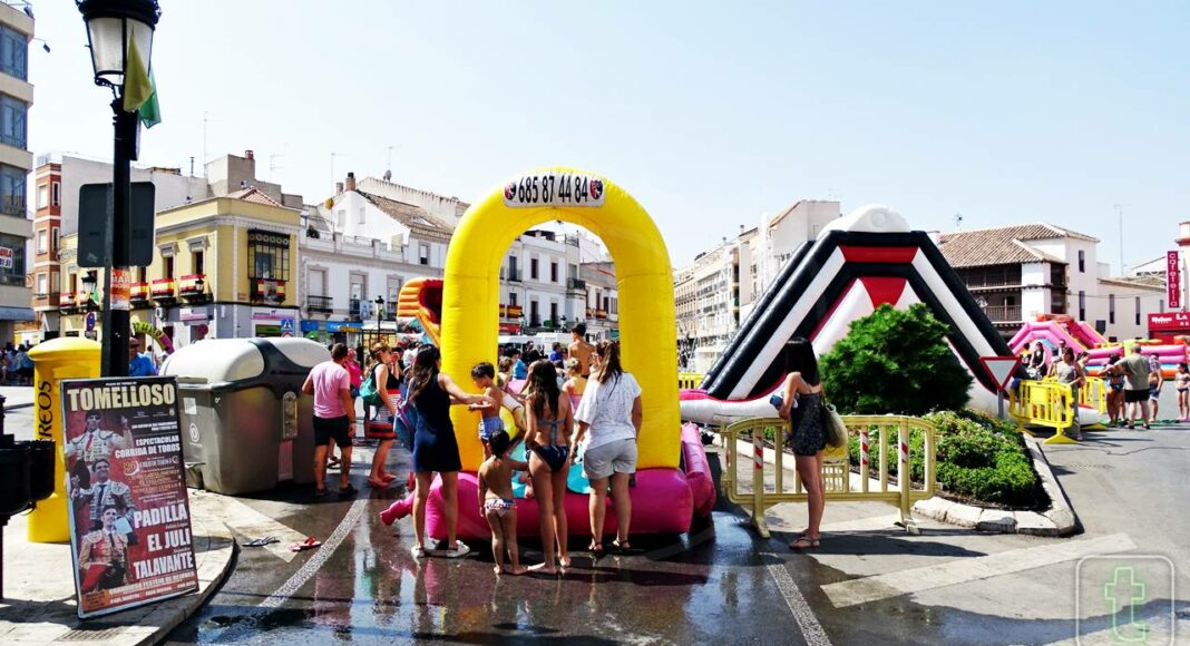 Refrescantes atracciones en la primera mañana de feria que incluían una pista americana, tobogán gigante, deslizador acuático, entre otras.