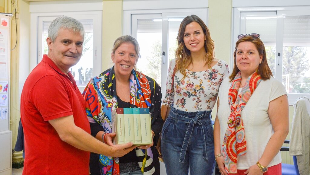 La visita también ha servido para hacer entrega a la biblioteca del San Antonio de un ejemplar de las Obras Completas de García Pavón, edición que está previsto llevar a todos los colegios de Tomelloso.