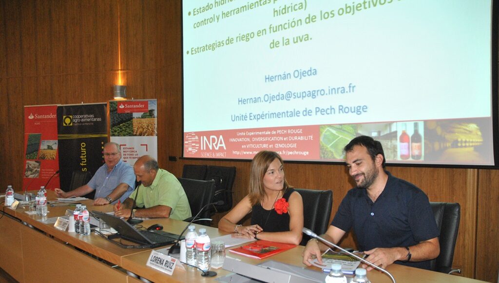 Rubio, que ha estado acompañado en esta presentación por Francisco José Garrido, portavoz de la sectorial vitivinícola de Cooperativas Agroalimentarias, Félix Yañez, director del IVICAM y Lorena Ruiz, responsable territorial Agro-La Mancha del Banco de Santander, ha destacado la importancia de este curso para las características de una región como CLM y para que los agricultores se informen y se formen sobre los nuevos métodos de riego. El ahorro va implícito a su uso, ha recordado, y se puede hacer un gran trabajo en esta zona en torno a la eficiencia hídrica que se puede conseguir.
