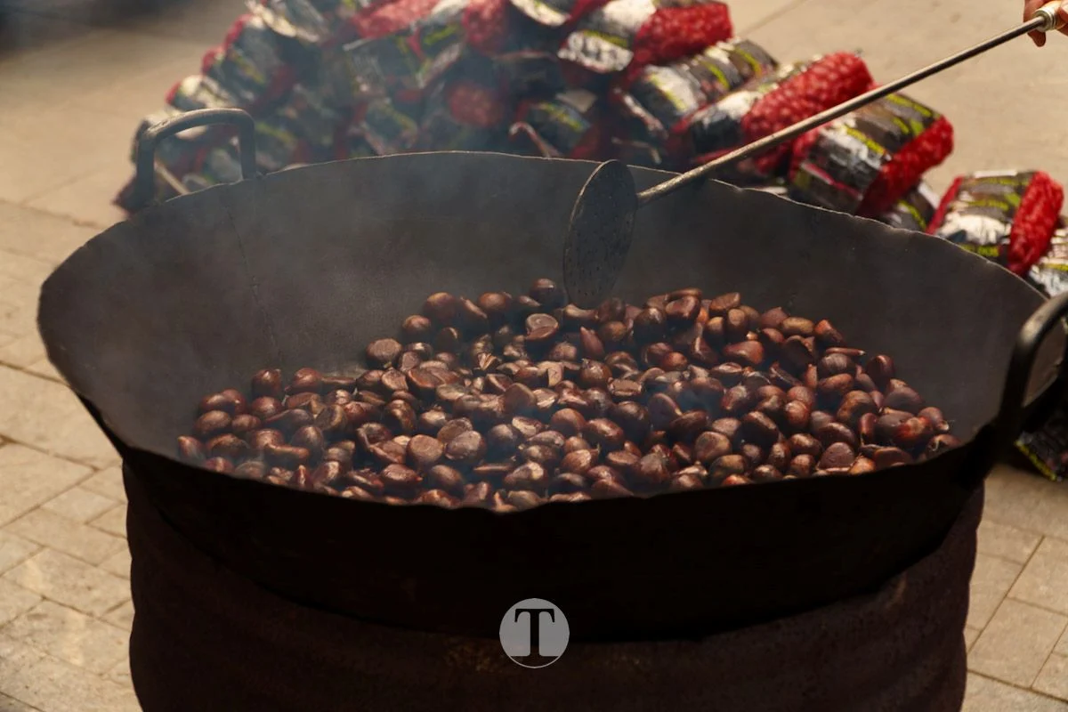 Uno de los productos más buscados son las castañas asadas, que marcan con su aroma el ambiente del mercadillo. “¡Castañas, nueces, pistachos”, anuncian los vendedores en plena faena, mientras el humo indica que ahí se están asando castañas. A su lado, compañeros de otros puestos despachaban almendras garrapiñadas, higos secos, kikos y todo tipo de frutos tradicionales.