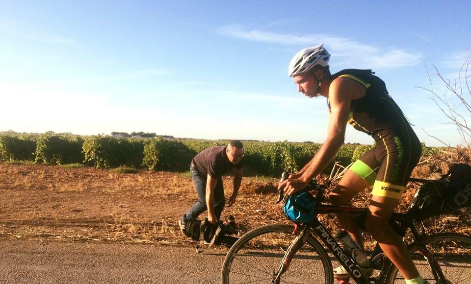 Aunque tuvo que desviarse algunos kilómetros de su ruta principal, entre las ciudades de paso tenía que estar Tomelloso, tierra en la que nació y que no dudó en utilizar sus colores para afrontar este reto vistiendo el verde y amarillo del Atlético Tomelloso Triatlón, club al que pertenece aunque lleva tiempo alejado de la competición.