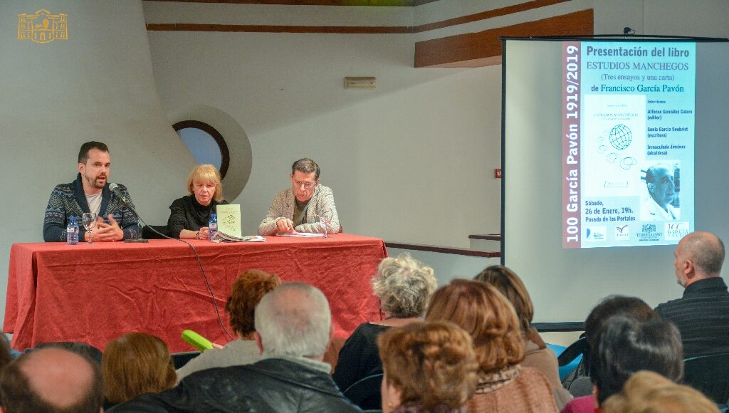 La presentación del libro “Estudios Manchegos. Tres ensayos y una carta”, de Francisco García Pavón, abrió el sábado los actos programados con motivo del I Centenario del nacimiento del escritor tomellosero, que se conmemora este año. El libro, que fue publicado por primera vez en 1951, ha sido reeditado por la editorial Almud, con el apoyo económico del Ayuntamiento de Tomelloso y gracias a la colaboración de los herederos del escritor, en particular de su hija, Sonia García Soubriet, que participó en el acto, junto con el concejal de Cultura, Raúl Zatón y el editor, Alfonso González-Calero.