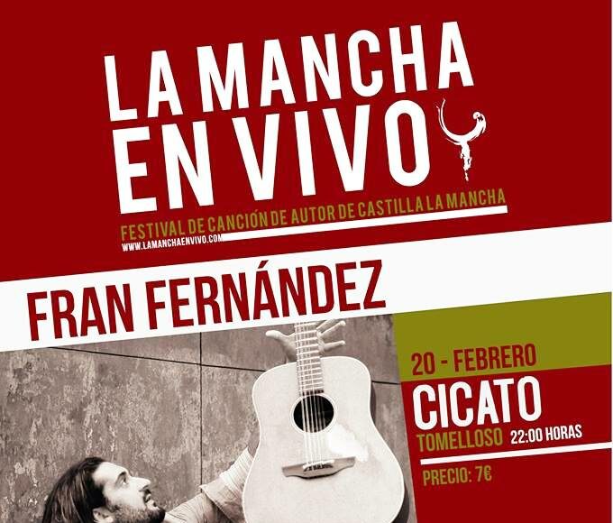 Este viernes la Sala CICATO de Tomelloso dentro del el primer Festival de Canción de Autor de Castilla-La Mancha, La Mancha en Vivo, acoge la actuación de Fran Fernández. Será a las 22:00 horas y el precio de las entradas es de 7 euros.