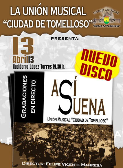 El sábado 13 de abril a las 19.30 h. en el Auditorio López Torres se presentará al público el nuevo CD que ha editado la Unión Musical Ciudad de Tomelloso, un proyecto que ha contado con la colaboración de la Diputación de Ciudad Real, Bodegas Centro Españolas y el Ayuntamiento de la ciudad. Bajo el título “Así Suena”, se trata de una recopilación de grabaciones en directo realizadas entre Septiembre del 2011 y Julio del 2012.