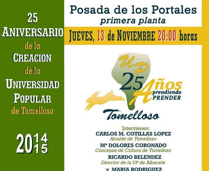 En este acto participarán el alcalde de la ciudad, Carlos Cotillas; la concejala de Cultura, María Dolores Coronado; el director de la UP de Albacete, Ricardo Beléndez y la coordinadora de la UP de Tomelloso, María Rodríguez. La actividad finalizará con la proyección de un vídeo sobre los últimos años de la Universidad Popular de Tomelloso.