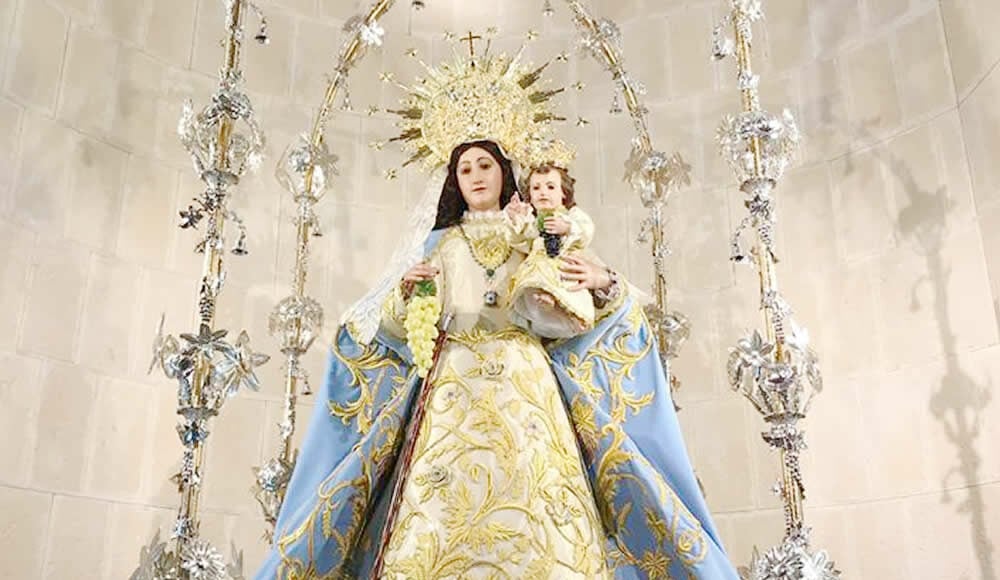 Este año, nuestra patrona, la Virgen de las Viñas, estrenará vestido. Compuesto por corpiño y saya confeccionados en tisú de seda y bordado en hilo de tres oros con toques de seda natural azul. Un conjunto elaborado por Fran Perales en Torralba de Calatrava.