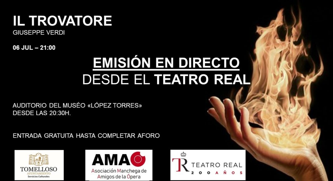 El Auditorio López Torres acogerá este sábado, 6 de julio, a partir de las 21´00 h., la retransmisión en directo de la ópera ‘IlTrovatore’, desde el Teatro Real de Madrid. Una función en directo que se va a retransmitir vía satélite para toda España y que se podrá seguir desde el López Torres gracias a la colaboración del Ayuntamiento de la localidad, la Asociación Manchega de Amantes de la Ópera (AMAO) y el Teatro Real. La entrada es gratuita.