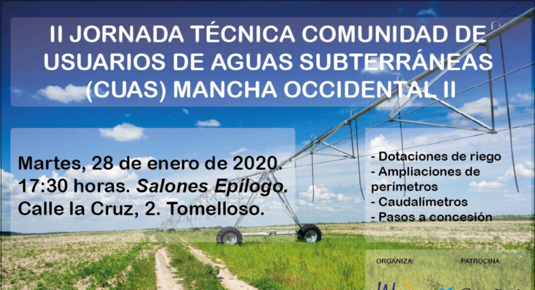 La Comunidad de Usuarios de Aguas Subterráneas (CUAS) de la Masa Mancha Occidental II celebrará su II Jornada Técnica sobre Aguas Subterráneas el próximo martes 28 de enero en Tomelloso (Ciudad Real). Será a partir de las 17:30 horas en Salones Epílogo, en la calle de la Cruz, 2.