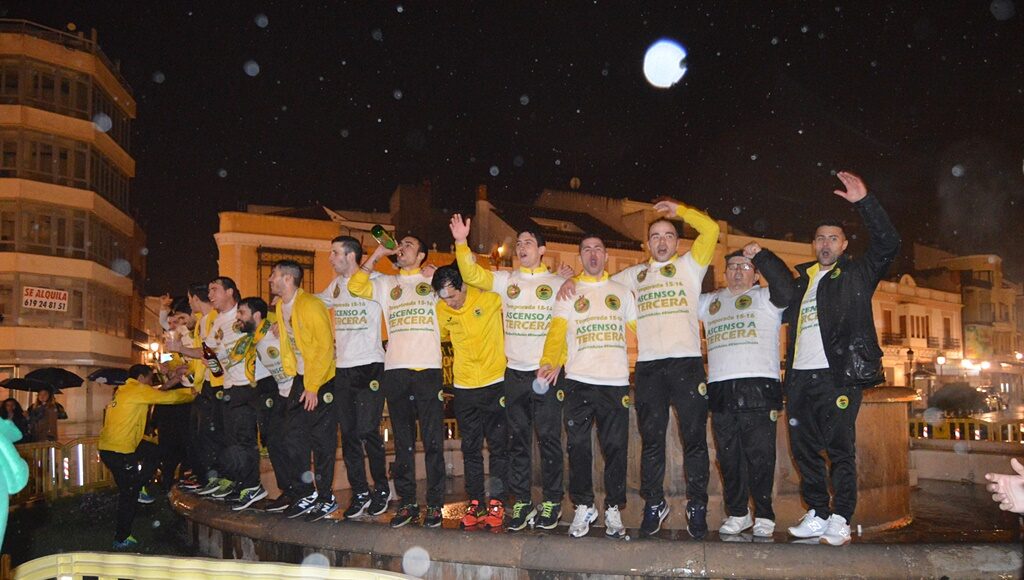 La lluvia no amilanó al más de un centenar de aficionados acudieron a la plaza de España para celebrar el ascenso a Tercera División del Atlético Tomelloso: el sueño cumplido. El equipo llegó a la plaza en el Pegaso clásico de Juan Antonio Ruiz, bailaron sobre la fuente y recibieron los abrazos y elogios de la afición mientras en Tomelloso diluviaba.