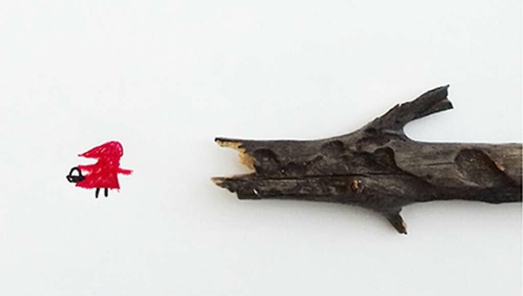 Hace tiempo Noelia empezó a desarrollar un tipo de ilustración que combina el propio dibujo con el objeto, como se puede apreciar en la foto de portada en la que un palo interpreta al lobo y el dibujo pintado en rojo es caperucita. La sencillez y lo cotidiano define un trabajo que lleva un gran esfuerzo detrás. «Utilizo objetos reales cotidianos, de mi día a día, de mi rutina, también comida. Observo el objeto, me sugiere algo y lo plasmo y traslado ese concepto que me imagino en el papel», nos explicaba Noelia.
