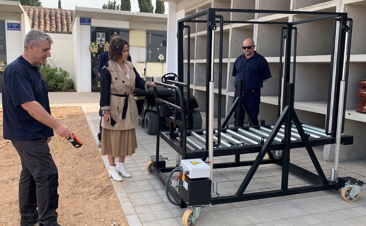 Este mecanismo, pionero, ha sido diseñado con la colaboración de ITECAM a partir de la idea de Mario Fernández Burillo, trabajador del Cementerio, y fabricado por la empresa de Tomelloso TAINMA Talleres de La Mancha S.L.. Ha sido adquirido por importe de 9.680 euros.