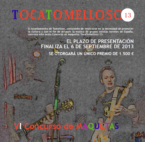El Ayuntamiento de Tomelloso a través de su Concejalía de Juventud, consciente de implicarse en la necesidad de promover la cultura y con el fin de difundir la música de grupos o solistas noveles de España convoca este Sexto Concurso de Maquetas TocaTomelloso|13 con arreglo a las siguientes bases: