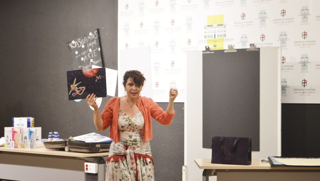La artista, a partir de su propio trabajo, estableció un camino paralelo de lo que va a ser la vida laboral de los chicos y chicas. Partiendo de un problema, que en el caso de Violeta es un dibujo, pero puede ser cualquier otro, explico al público como hay que ir simplificando, incluso destruyéndolo, para construir algo más complejo. Mediante la comparación la escritora ha hablado de lo que va a ser la vida de trabajadores de los chicos y chicas que llenaron el salón de actos de la Casa de la Cultura.