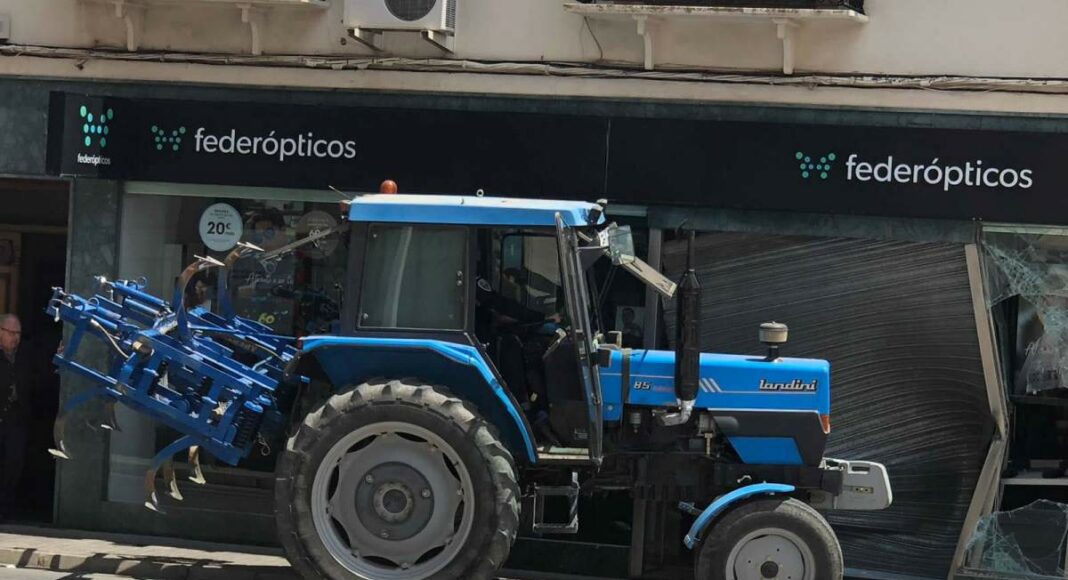 Alrededor de las 15:00h de la tarde de este martes un tractor ha colisionado contra la entrada y escaparate de Federópticos Vega en plena Plaza de España de Tomelloso.