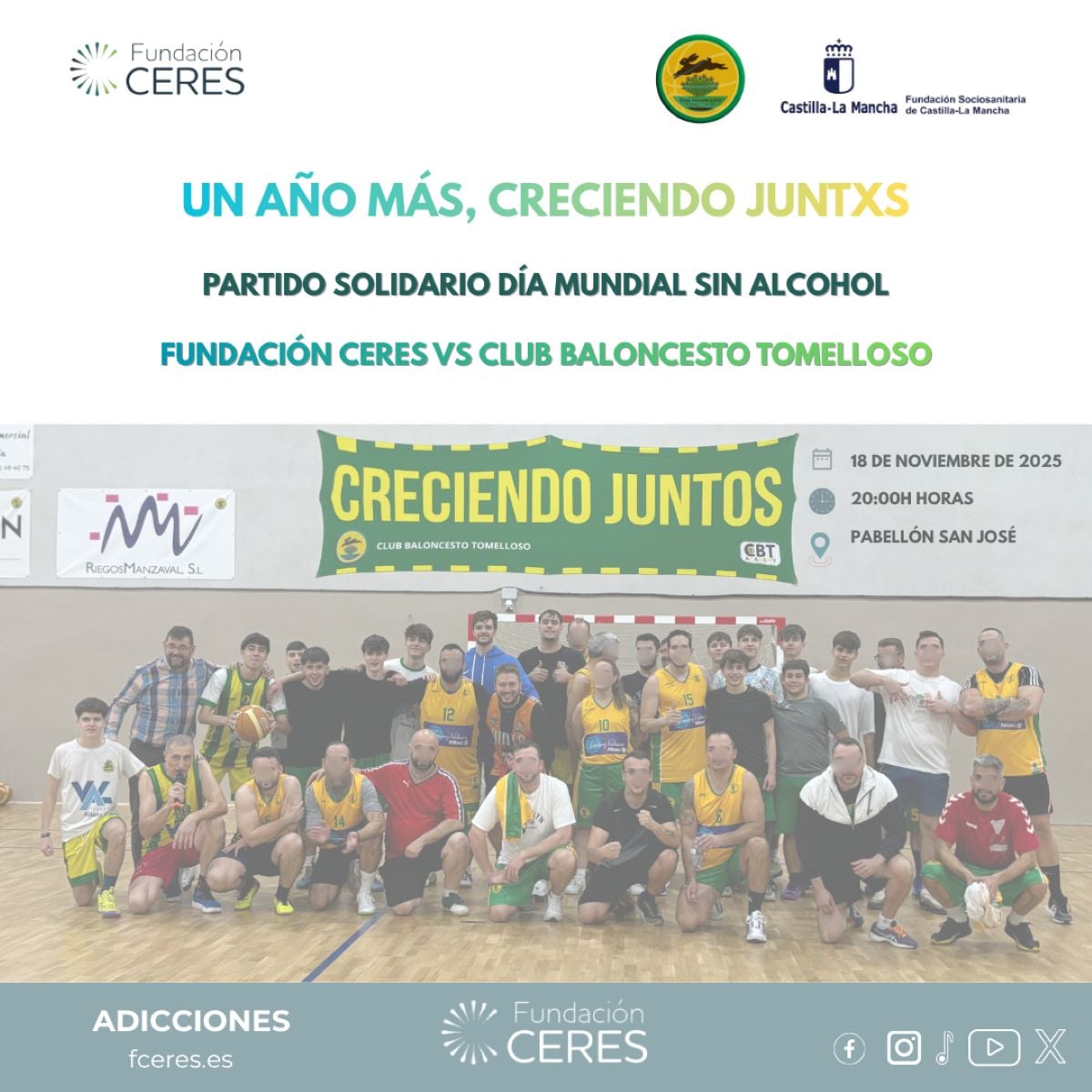 Fundación Ceres, en colaboración con el Club Baloncesto Tomelloso, celebrará el 18 de noviembre a las 20:00 horas un Partido Solidario en el Pabellón San José con motivo del Día Mundial sin Alcohol, una fecha destinada a concienciar sobre los riesgos asociados al consumo de alcohol y promover estilos de vida saludables en la comunidad y en las personas jóvenes.
