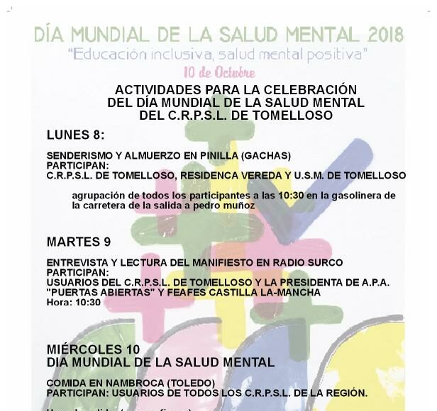 La Asociación Puertas Abiertas y el CRPSL de Tomelloso quiere celebrar, un año más, el Día Mundial de la Salud Mental, que se celebra en más de 100 países el 10 de octubre con una serie de actividades que se realizan durante la semana del 8 al 11 de octubre.