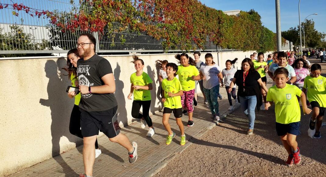 Una marea amarilla de alumnos, familias y profesores se ha puesto las zapatillas para correr por las calles que bordean el colegio, creándose un gran ambiente de emoción, entusiasmo y deporte, amenizado por Pilar Daza Morales, secretaria del centro, que animó en todo momento a los corredores.
