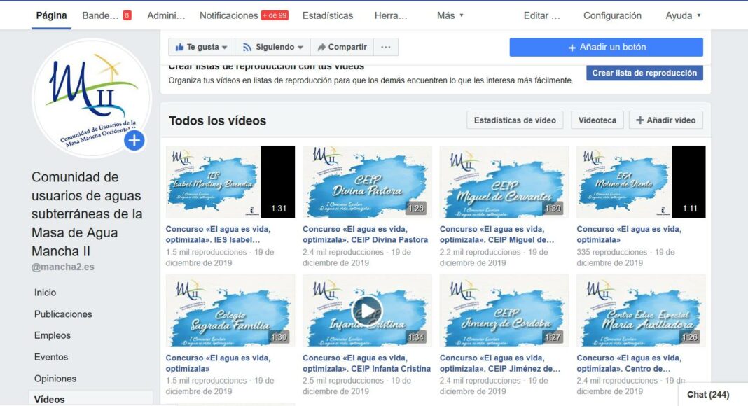 Los ocho vídeos presentados al I Concurso Escolar ‘El agua es vida. Optimízala’, organizado por la Comunidad de Usuarios de Aguas Subterráneas (CUAS) de Mancha Occidental II, están alcanzando unas cifras “espectaculares” de participación en el perfil de Facebook donde están publicados los trabajos.