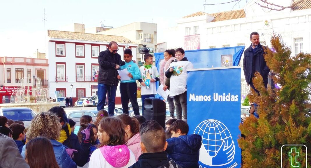 Este mediodía, los niños y niñas de Tomelloso se han unido a una iniciativa solidaria desarrollada en la ciudad: la VI edición de las 24 horas de Manos Unidas. Se trata de un acto simbólico en el que los alumnos de unos 6 o 7 colegios de Tomelloso han leído el compromiso que han elegido para el evento.