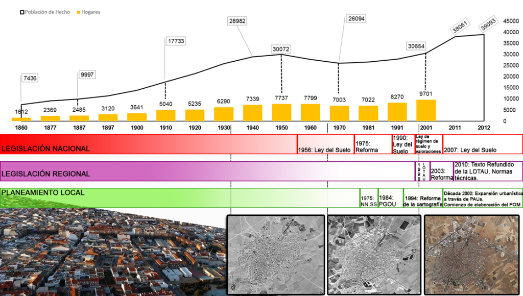 Por último, en las cuestiones exclusivamente relativas a la demografía, hemos decidido mostrarles dos infografías realizadas para entender en primer lugar el peso estratégico de la Mancha y su concentración población respecto a la provincia de Ciudad Real, y conocer el peso concreto de Tomelloso. Esto es posible gracias a que cada término municipal de nuestra provincia se eleva como una columna en un gráfico representando el volumen de su población, así podemos ver cuales términos están más poblados y que áreas son las más significativas demográficamente hablando. Para terminar, podrán ver un sencillo gráfico de evolución demográfica de Tomelloso, donde se muestra nuestra evolución población desde 1860 hasta la actualidad, así como la variación de los hogares/viviendas en el mismo período. Se incluye también una evolución de la legislación en materia de planificación urbana y territorial en el mismo umbral temporal, y una sencilla muestra de la evolución urbana del Casco gracias a las fotografías aéreas disponibles y a través de algunas fotografías significativas de nuestra ciudad, obtenidas gracias al Archivo Histórico de Tomelloso.