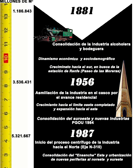 Por ello se inicia un proceso centrífugo donde la práctica totalidad de las bodegas y alcoholeras identificadas, terminan por abandonar sus antiguas instalaciones y marcharse progresivamente a los nuevos espacios industriales, desapareciendo así la convivencia de espacios mixtos en el casco urbano. Los solares que se irán generando hasta 1987 derivados de este proceso de deslocalización, comenzaran a convertirse en activos estratégicos desde el punto de vista inmobiliario por su posición próxima al centro y tendrán una fuerte repercusión en el modelo urbano de los años ‘90 y 2000. Estas superficies, que antes tenían un gran valor desde el punto de vista de la producción industrial y que eran herencia del proceso industrializador ligado al cultivo de la vid, se reconvierten en promociones de viviendas de nuevas tipologías edificatorias tales como los adosados y las viviendas colectivas, densificando el centro-oeste local.